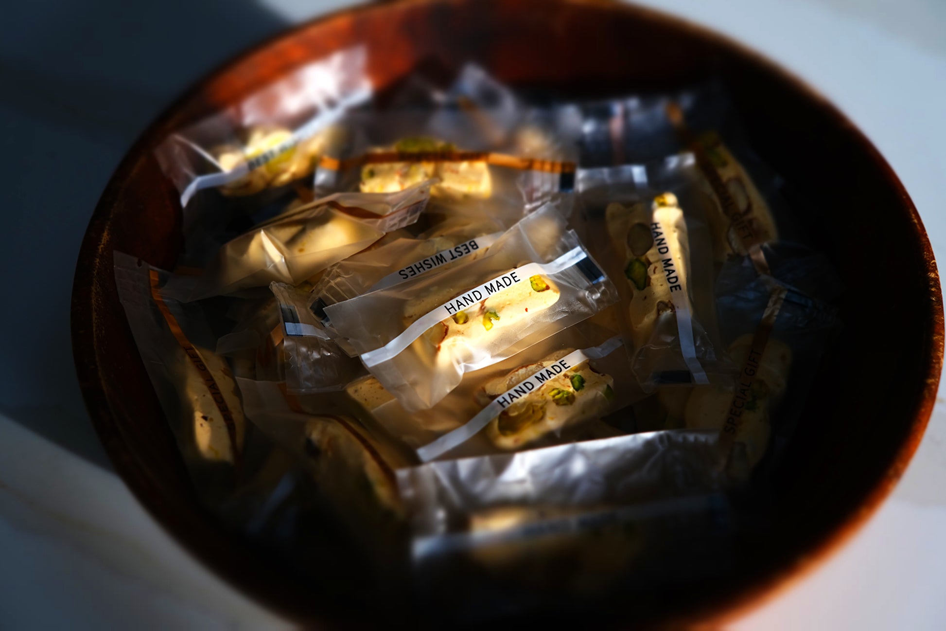 Handmade Taiwanese-style nougat offering a satisfying chewy consistency and a deliciously creamy flavour, enriched by the irresistible crunch of roasted pistachios and almonds.